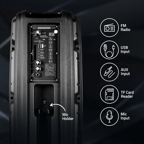 - Multiple Connectivity Modes: FM/USB/Aux In/TF Card & Wireless Mic.