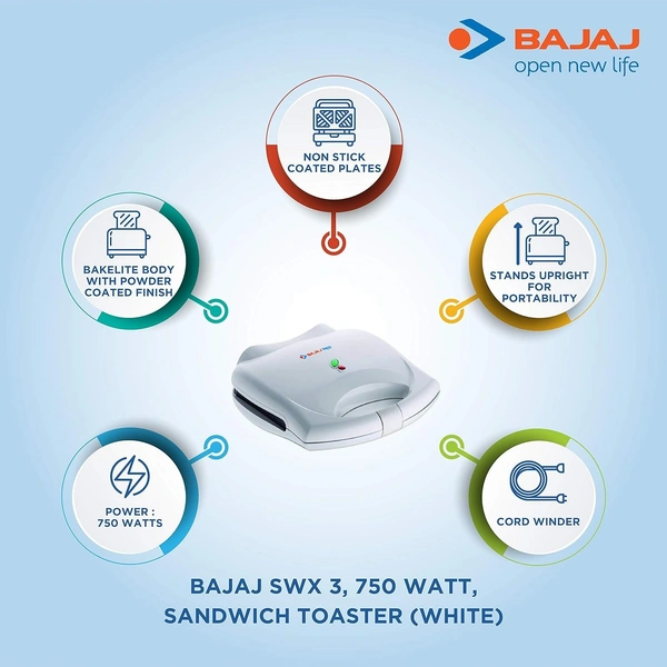 Bajaj Majesty New SWX-3, 2-Slice Sandwich Toaster (White)