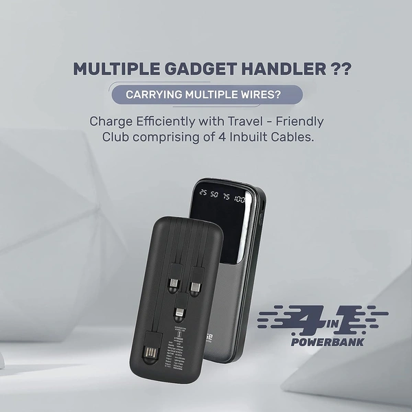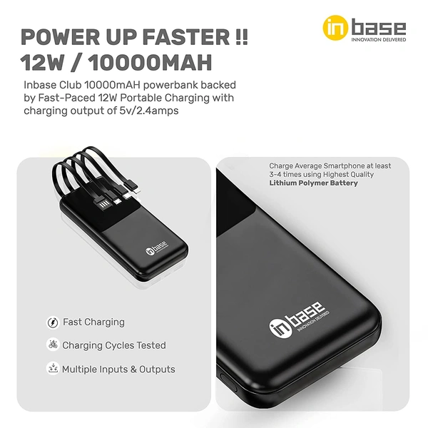 inbase Club Power Bank 10000mah Lithium Polymer Battery 12W Fast Power Delivery Charging 4 in 1 Inbuilt Cables (Black)